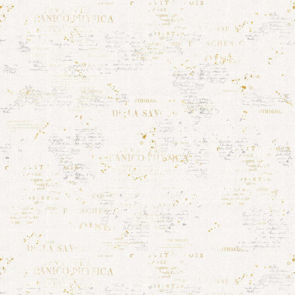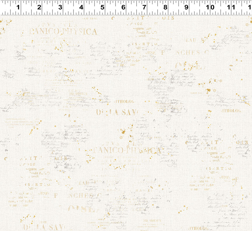 Words in grey and gold (brown) on a creme background. 100% cotton 43-44 inches wide.