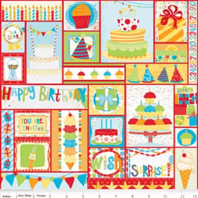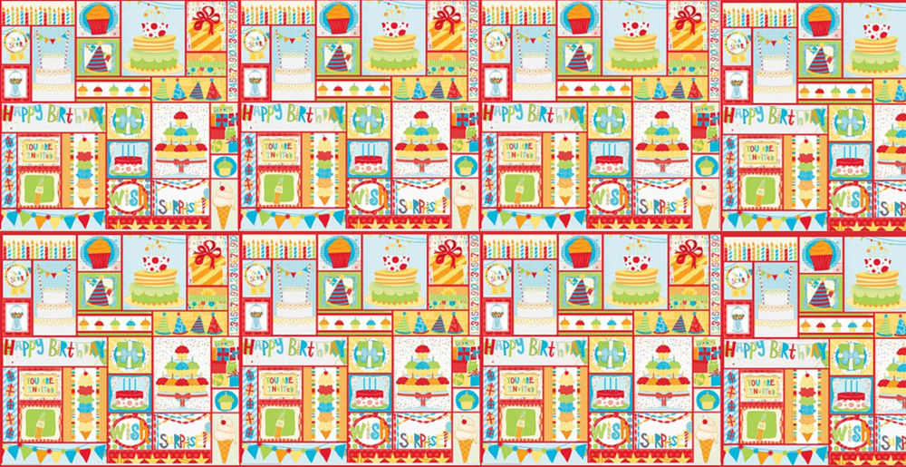 This is the focus fabric for the collection. It's a collage of birthday graphics in an off-set array that could be used as a panel or images cut apart for dish towels, pillowcases or table cloth. The colors are blue, green, yellow, and red. They are saturated and happy. 100% cotton 43-44 inches wide